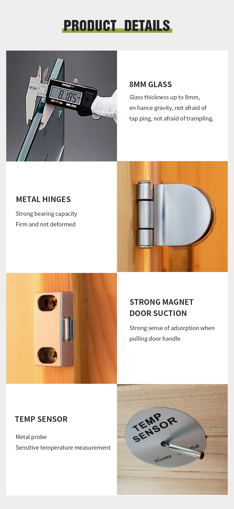 8 mm dickes gehärtetes Glas: Wie in den Produktdetails gezeigt, verfügt der Infrarot- und Dampfsaunaraum aus Holz für 1–3 Personen über 8 mm dickes gehärtetes Glas. Es zeichnet sich durch außergewöhnliche Haltbarkeit aus und verbessert die Schwerkraftbeständigkeit. Sie müssen sich keine Sorgen über Stöße oder Tritte machen – es ist so konstruiert, dass es dem täglichen Gebrauch standhält.