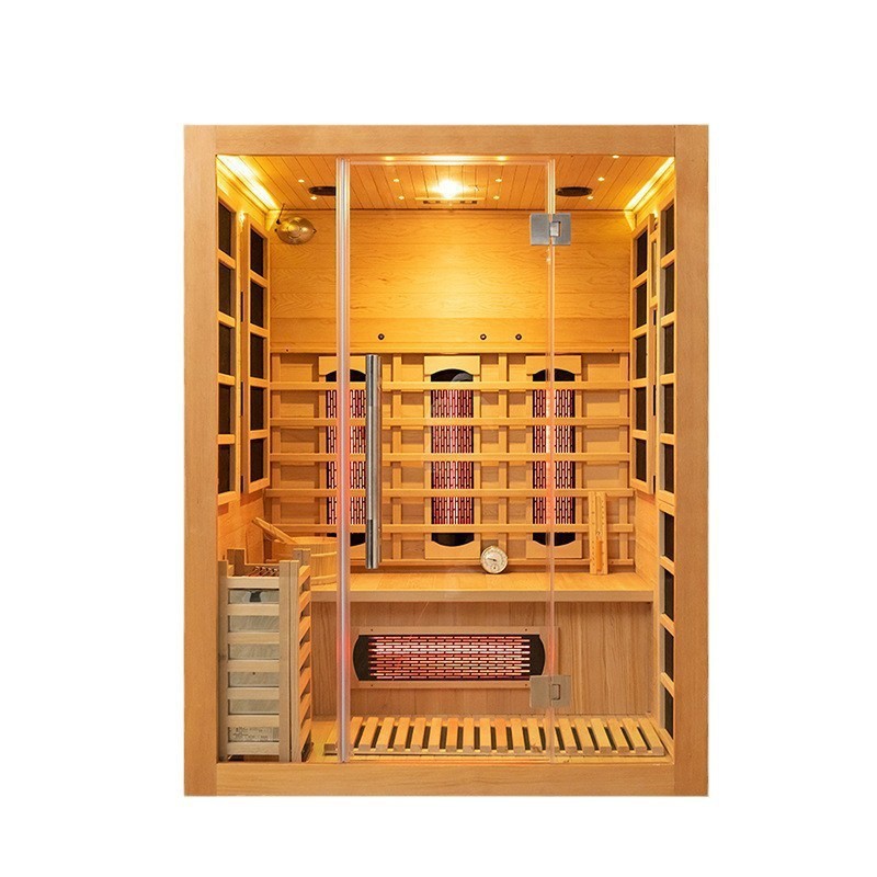 Der Holz-Infrarot- und Dampfsaunaraum für 1–3 Personen ist vollgepackt mit fortschrittlichen Funktionen, die Ihre Wellness-Reise verbessern: Infrarotheizungen und Ferninfrarot-Graphen-Heizplatten (sorgen für eine gleichmäßige, effiziente Erwärmung für tiefen, entspannenden Schweiß); Sauerstoffionisator (reinigt die Luft in der Sauna und schafft eine frische und belebende Atmosphäre); Leselicht und Lautsprecher (ermöglicht Ihnen, während Ihres Saunagangs zu lesen oder Musik zu hören); Bedienfeld (ermöglicht die einfache Anpassung von Temperatur, Zeit und anderen Einstellungen für ein personalisiertes Erlebnis); Saunaofen und Lichtwellenröhre (wirken zusammen, um Dampf und Infrarotwärme zu erzeugen und sind sowohl für Dampf- als auch für Ferninfrarot-Saunaliebhaber geeignet).