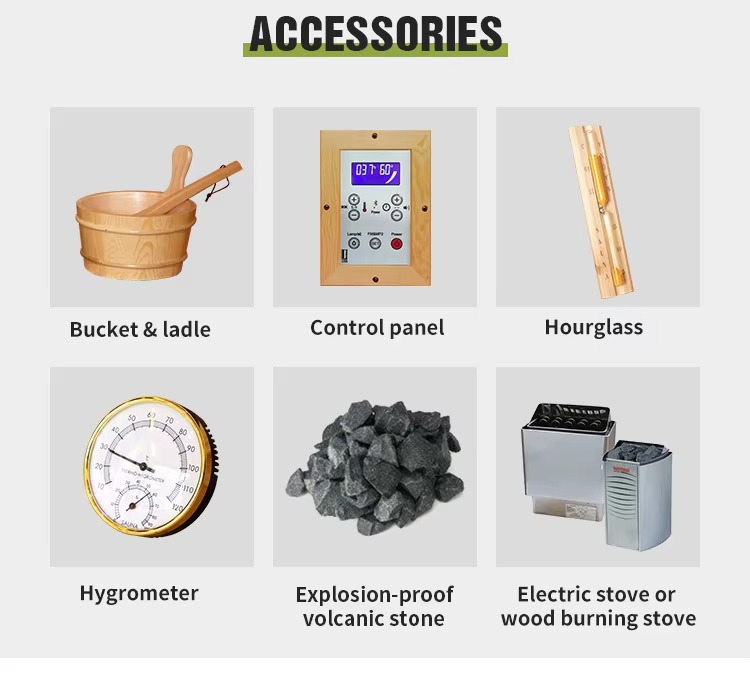 • Innere: Vollständig mit Massivholz umhüllt + sanftes Umgebungslicht, ausgestattet mit Tischen und professionellen Saunaöfen, die eine warme und entspannende Saunaatmosphäre schaffen