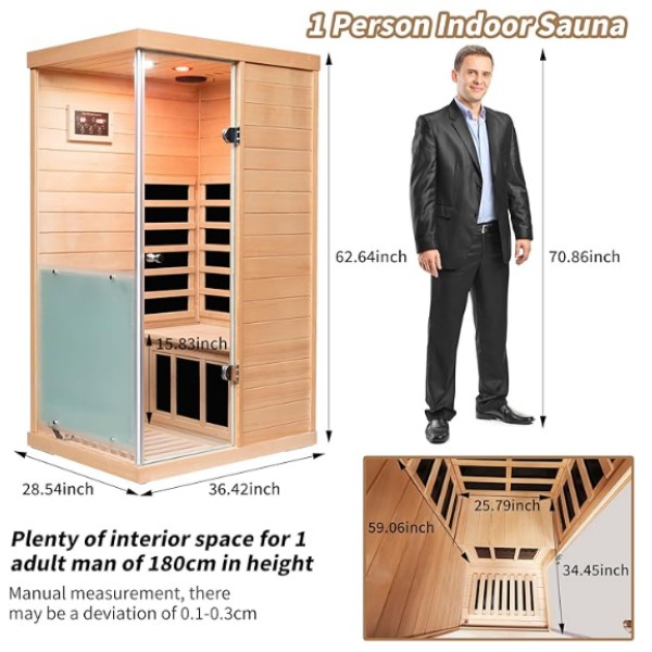 · 【Geringe Stellfläche, einfach zu installieren】: Infrarotsauna für 1 Person. Geringe Stellfläche, kann jederzeit in Schlafzimmern, Badezimmern und Fitnessstudios verwendet werden. Die Innengröße beträgt 34,45 * 25,79 * 59,06 Zoll, was Platz für einen Erwachsenen mit einer Körpergröße von 180 cm bietet, und der Sitz kann eine maximale Belastung von 100 kg tragen. Nut- und Federdesign, einfach zu montieren, mit Installationsanleitung geliefert und kann innerhalb von 30 Minuten installiert werden.