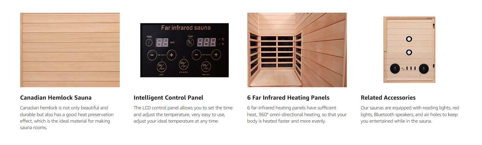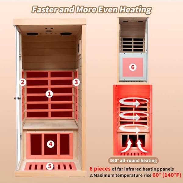 · 【360°-Rundumheizung, ausgestattet mit intelligentem Unterhaltungssystem】: Im Vergleich zu anderen Innensaunen verfügen wir über 6 Ferninfrarot-Epoxid-Heizpaneele, die schneller und gleichmäßiger aufheizen, mit einem maximalen Temperaturanstieg von 60° (140℉). , sodass Sie sich keine Sorgen mehr über unzureichende Wärme machen müssen. Ausgestattet mit 1*LED-Leselicht, 1*Rotlicht und 1*Bluetooth-Lautsprecher (Bluetooth-Gerätename: BT Speaker), können Sie in der Sauna lesen und Musik hören.