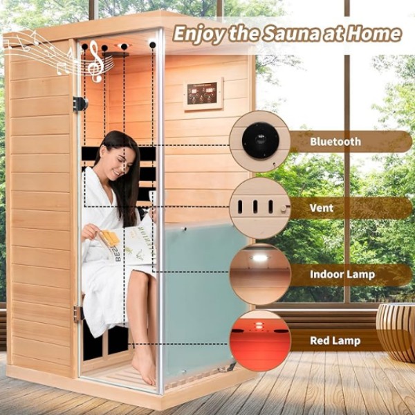 Die kleine Sauna für 1 Person zeichnet sich durch ein kompaktes und exquisites Design aus und eignet sich daher perfekt für Familien oder kleine Wohnräume. Obwohl der Innenraum kompakt ist, bietet er ausreichend Platz für eine Person, die sich bequem entspannen und die Sauna genießen kann.