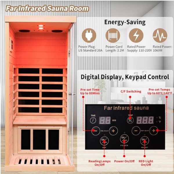 · 【Sicherheit, sichere Verwendung】: Digitalanzeige, Tastensteuerungssystem, Zeit und Temperatur können eingestellt werden, die voreingestellte Zeit beträgt bis zu 60 Minuten und die voreingestellte Temperatur beträgt bis zu 60° (140℉). Humanisiertes Temperaturkontrollsystem, Temperaturschutz 110°. Wenn während der Nutzung unserer Ferninfrarotsauna ein Stromleck auftritt, unterbricht die Schutzvorrichtung automatisch die Stromversorgung.